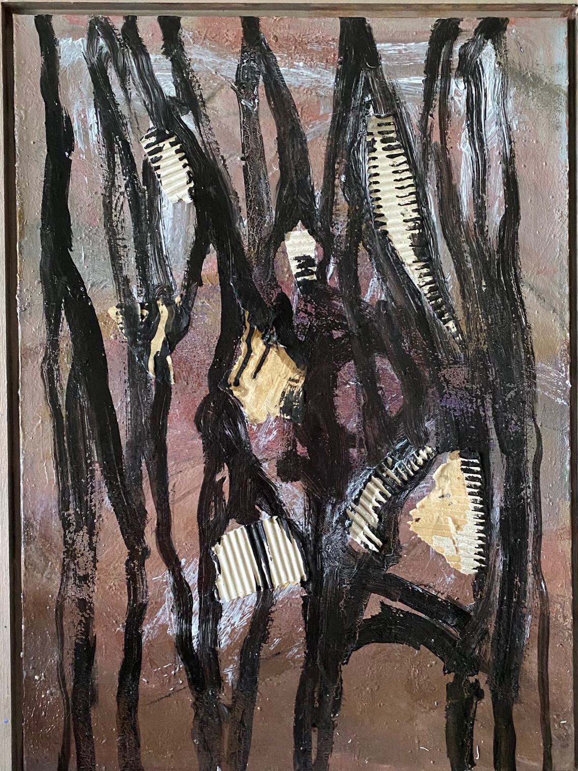 die Samen und Knollen in die Erde versenken, gießen, das rundum allzu hoch stehende Grünzeug ausrupfen, mich ins Atelier begeben, um dort nach dem Rechten zu schauen, bemalte Leinwände aussuchen, die ich übermalen würde. Und dann auch gleich eine der Leinwände mit Kleister bestreichen und Fetzen von Wellpappe drauf kleben, schwarze Pigmente und einen dicken Pinsel in Betrieb setzen und ein Bild produzieren, das ich „Nachtschattengewächse“ betitelte…