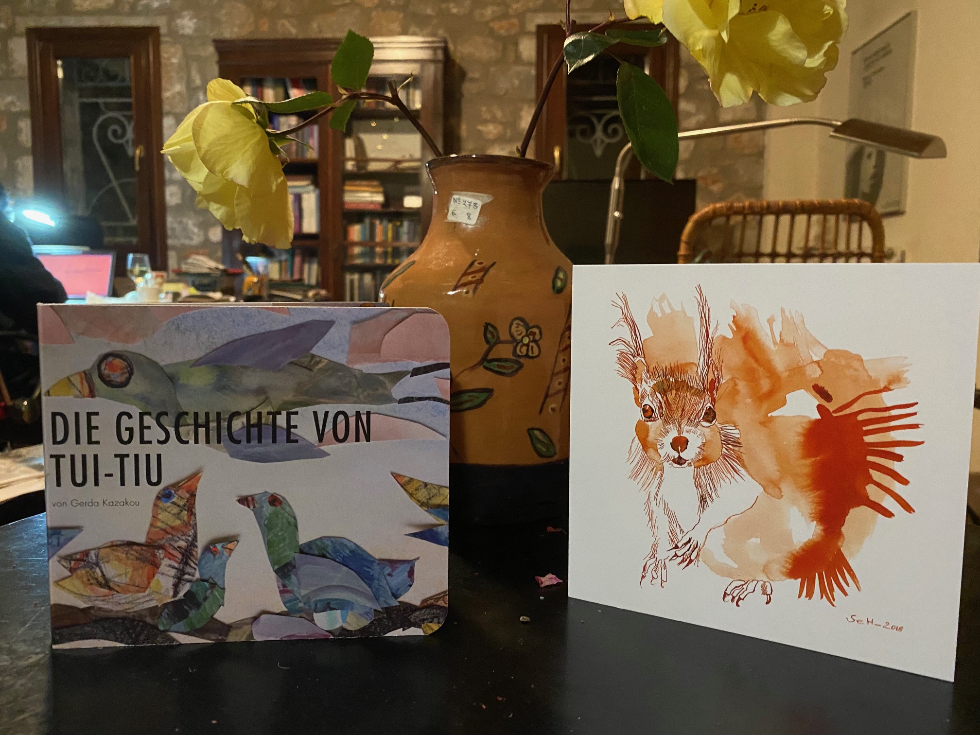 Wunderbar! Fein gestapelt kamen 16 Exemplare meines Tui-Tiu-Kinderbuchs, mehrere der hinreißenden Eichhörnchenkarten von Susanne Haun und etliche Kataloge des Eichhörnchenverlags von Nina Schuchardt zum Vorschein! Das Kinderbuch ist mit Legebildern aus Papierschnipseln illustriert – länger hier Mitlesende haben seine Entstehung miterlebt. Diese Exemplare bekam ich als Geschenk für meine Kunst-hilft-Aktion. Um sie auch für Griechen verständlich zu machen, werde ich ein Blatt mit Übersetzung hinzufügen.
