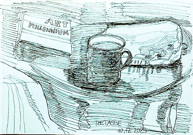 Also nahm ich meinen Stift und meinen Block und zeichnete die Teetasse mitsamt einer durchsichtigen Tüte mit Studentenfutter und dem Buch. Eine Wirkung hatte dieser schnelle Kontakt mit der Kunstwelt da draußen immerhin: ich experimentierte mit der Schraffur.
