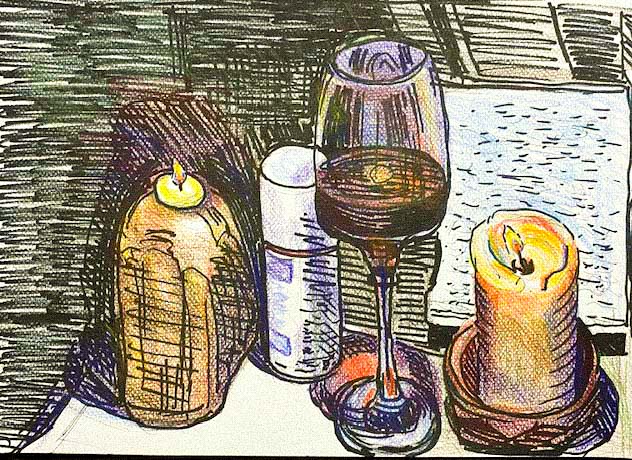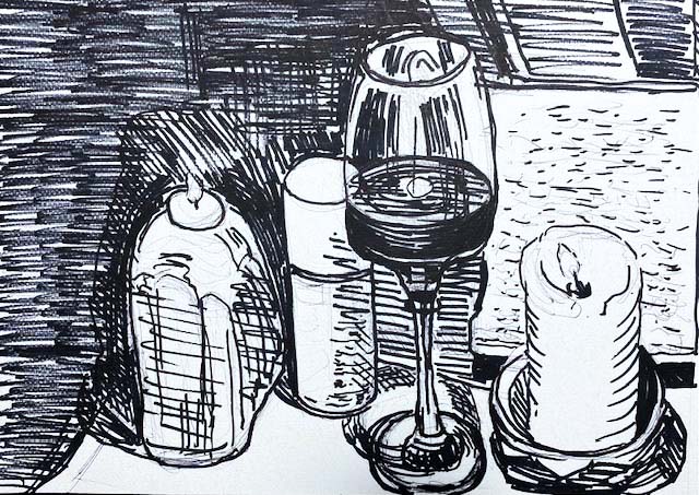 Schließlich fand ich noch eine Zeichnung vom Tagpfauenauge, der, vom roten Weinschatten besoffen, davontorkelte. Auch so kann man blind werden….